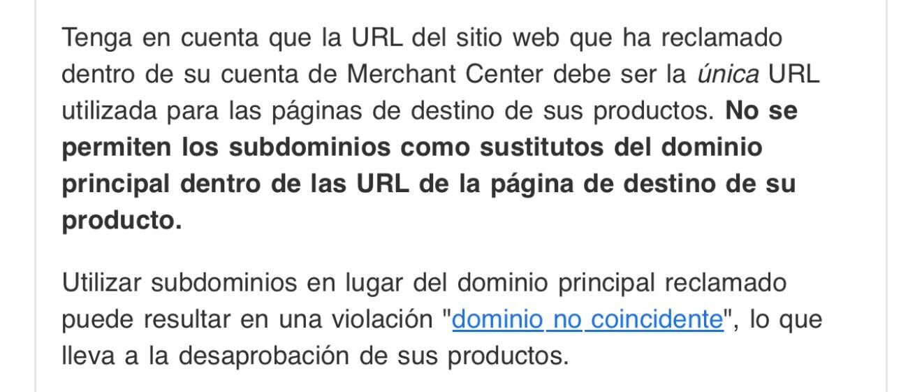 Por tanto, Google Merchant Center exige que la URL del sitio web registrado en la cuenta sea la única utilizada en las páginas de destino de los productos. Esto significa que no puedes usar subdominios distintos al dominio principal que has verificado en Merchant Center.