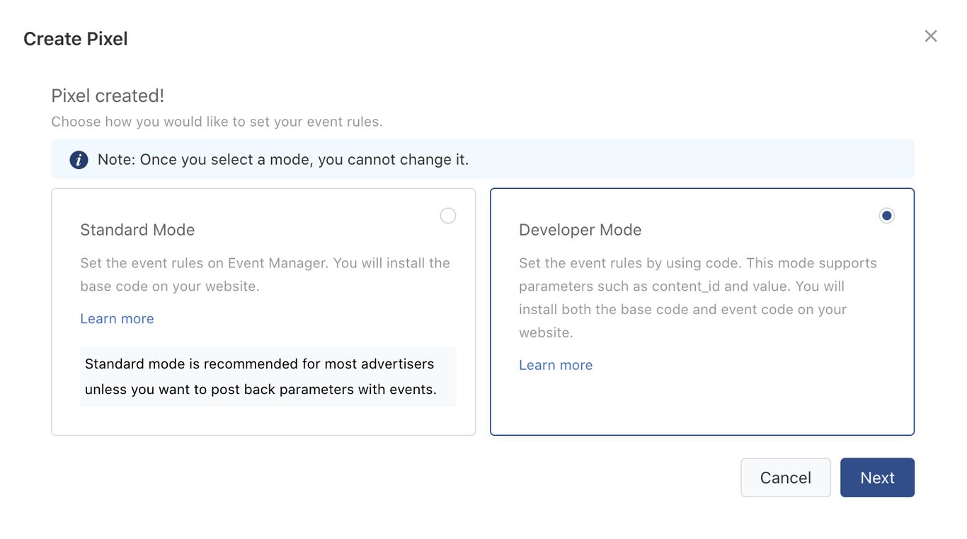 Este modo de implementación es avanzado, requiere modificaciones en el código y lo recomendamos a clientes que tienen dedicados recursos técnicos.Para crear el pixel sigue las instrucciones de la implementación básica, una vez creado selecciona la forma de implementación modo desarrollador (“Developer mode”).