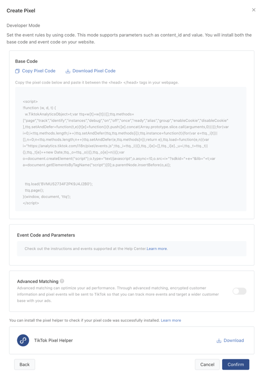El modo desarrollador, si usas la plataforma en inglés lo verás como “modo developer”, es un método de implementación del pixel de TikTok que da más flexibilidad a los eventos con los que configurar la acción de marketing. Permite a los anunciantes enviar parámetros en los eventos y es necesario para algunos productos de TikTok, entre los que se incluyen algunos basados en comportamiento web y retargeting.