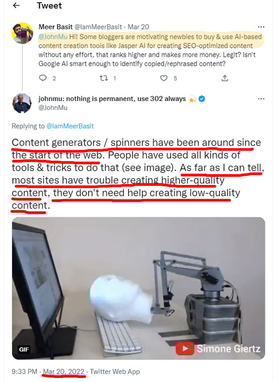 And he has also insisted on this idea in live broadcasts on the official Google Search central youtube channel:
