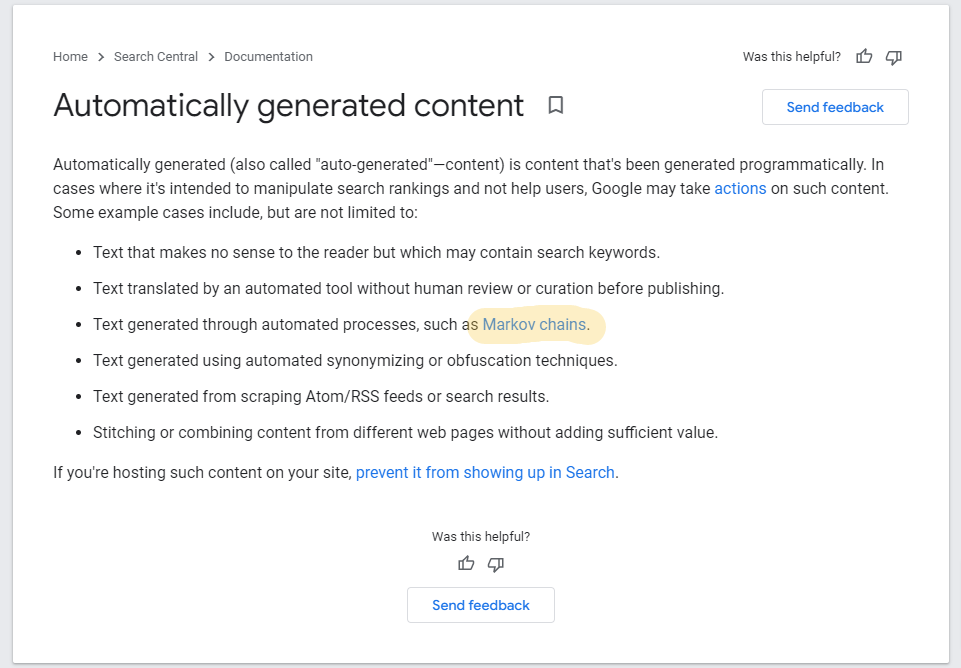 It seems obvious that Markov chains are employed by AI tools and therefore go against Google’s guidelines.